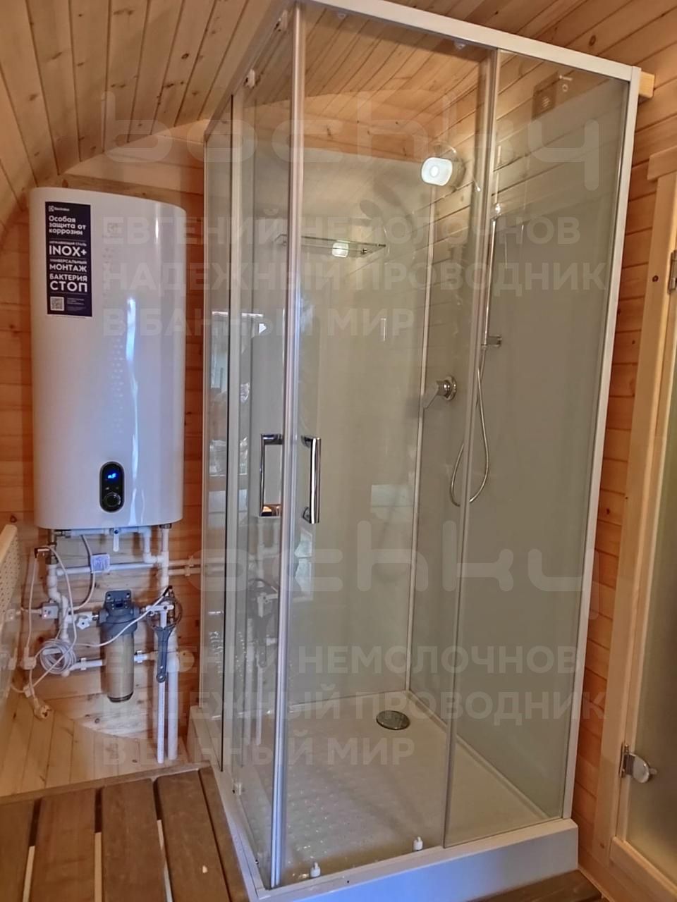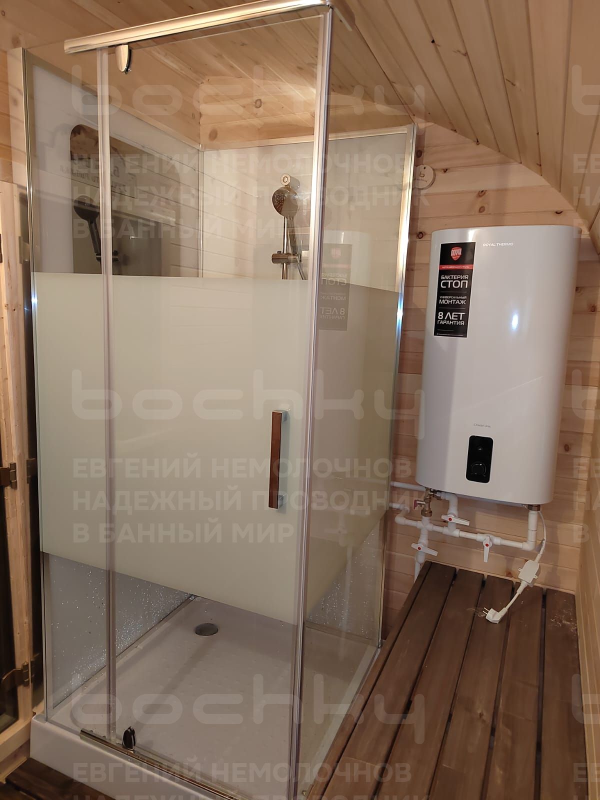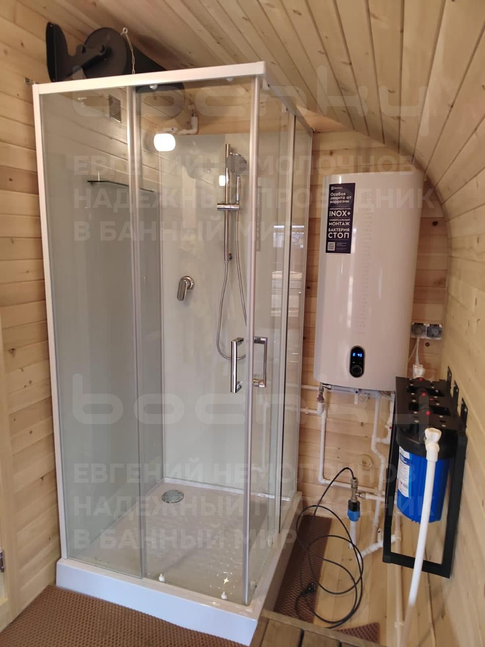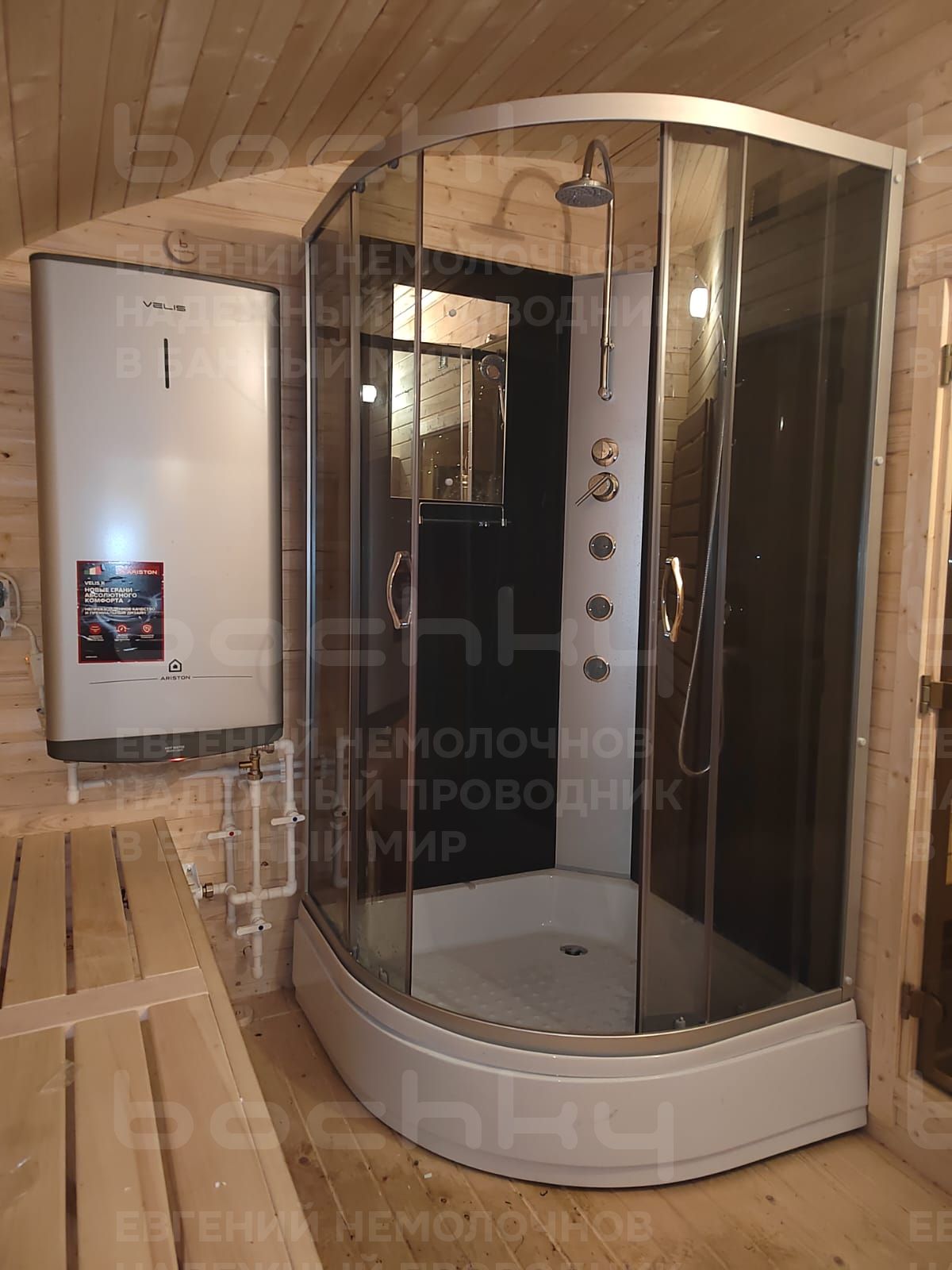 Классическое решение включает душевую кабину 90х90х200 см, бойлер на 50 литров, фильтр для воды, подключение труб и греющий кабель. По желанию заказчика возможен монтаж обливного устройства "Колобок"
