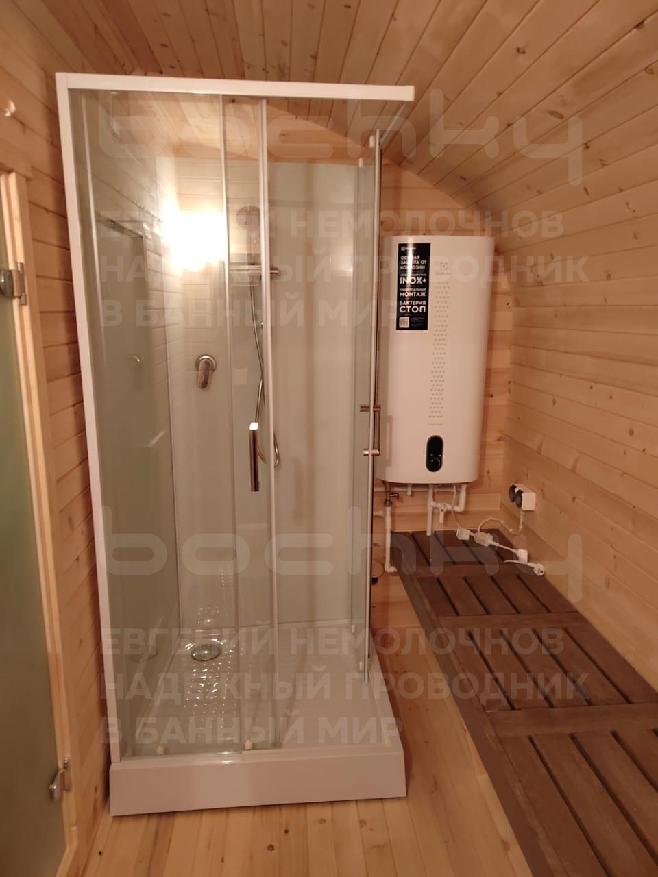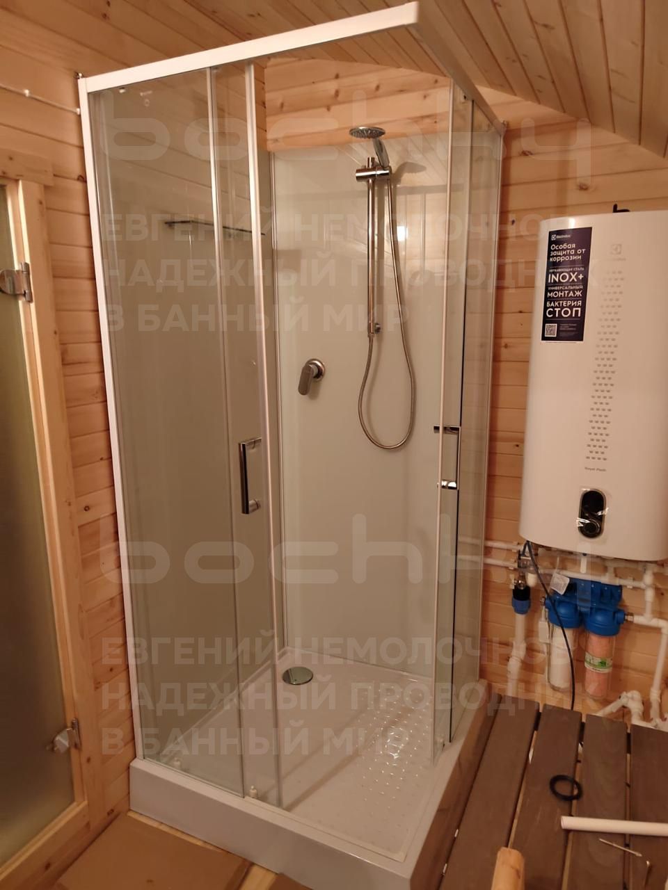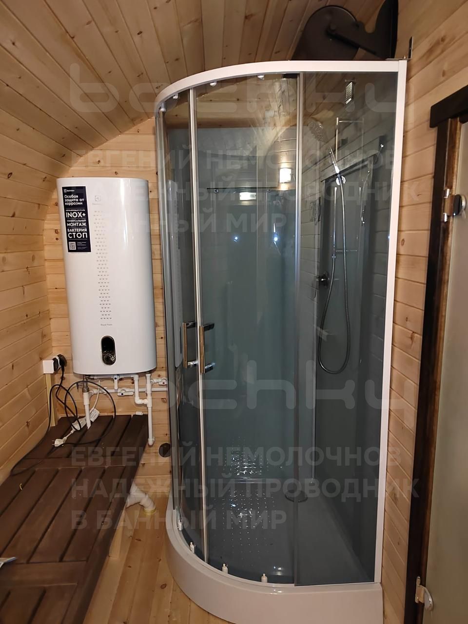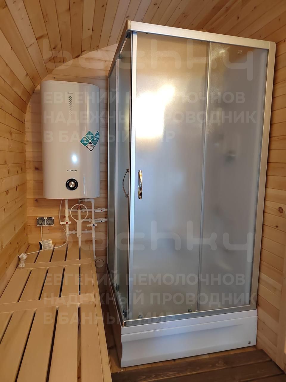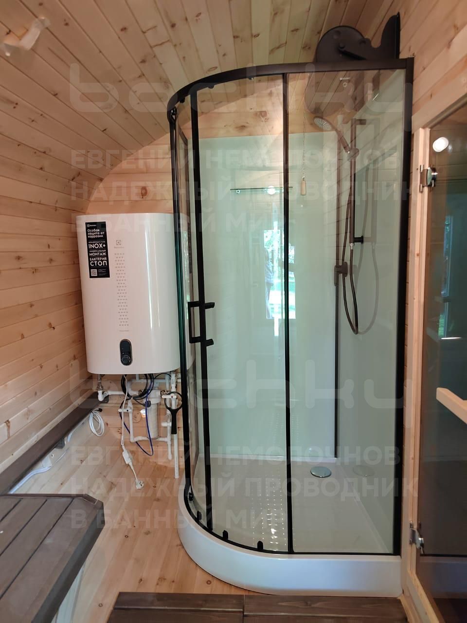 Классическое решение включает душевую кабину 90х90х200 см, бойлер на 50 литров, фильтр для воды, подключение труб и греющий кабель. По желанию заказчика возможен монтаж обливного устройства "Колобок"