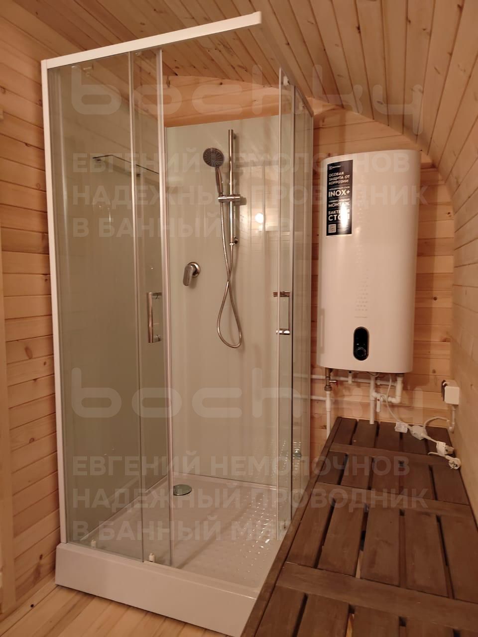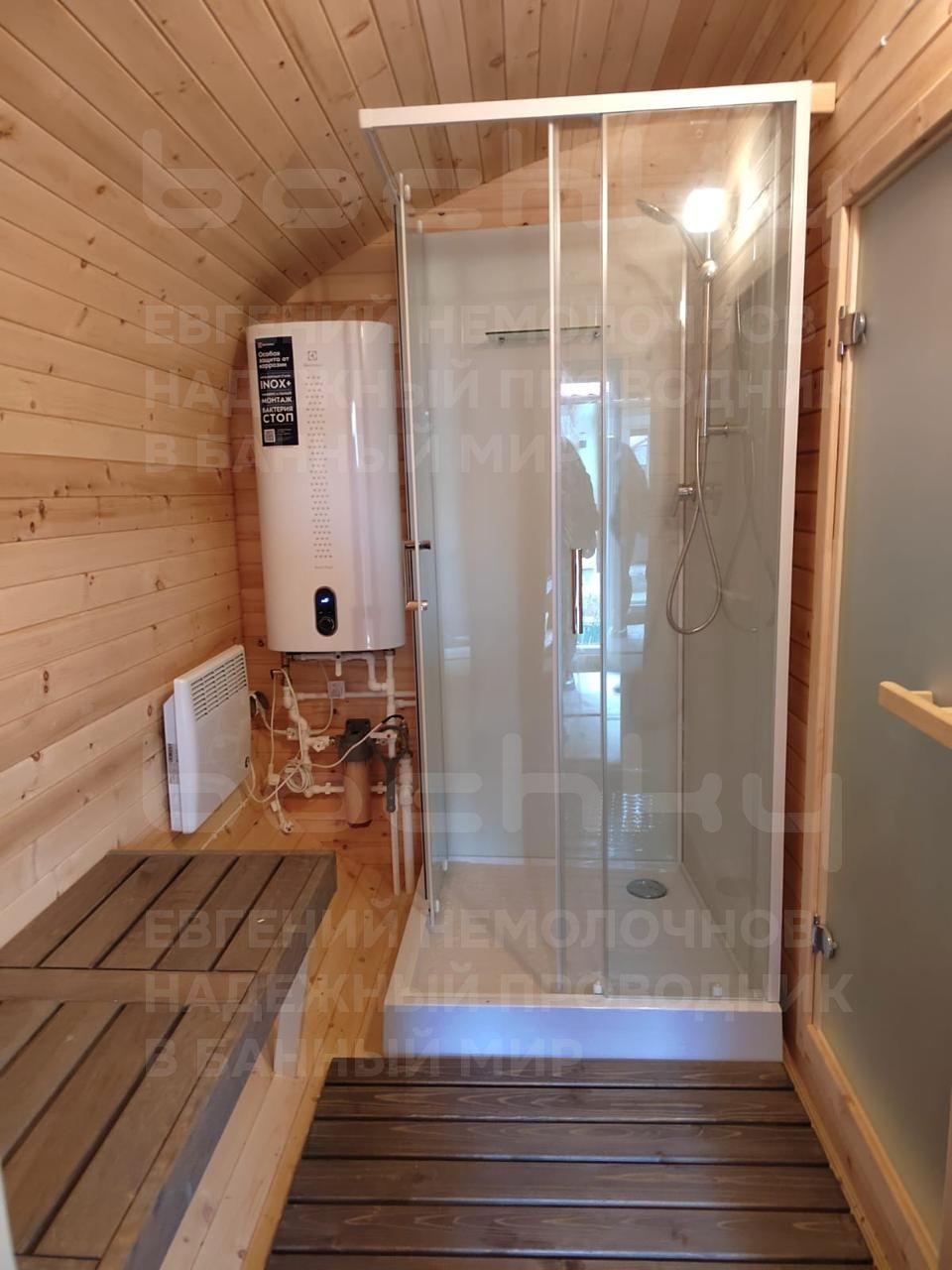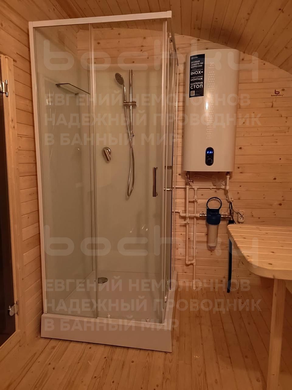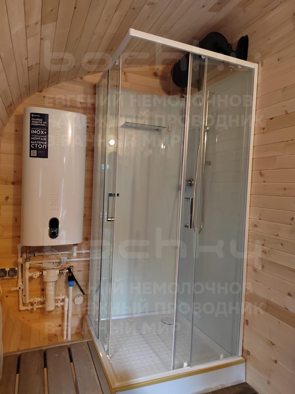 Классическое решение включает душевую кабину 90х90х200 см, бойлер на 50 литров, фильтр для воды, подключение труб и греющий кабель. По желанию заказчика возможен монтаж обливного устройства "Колобок"