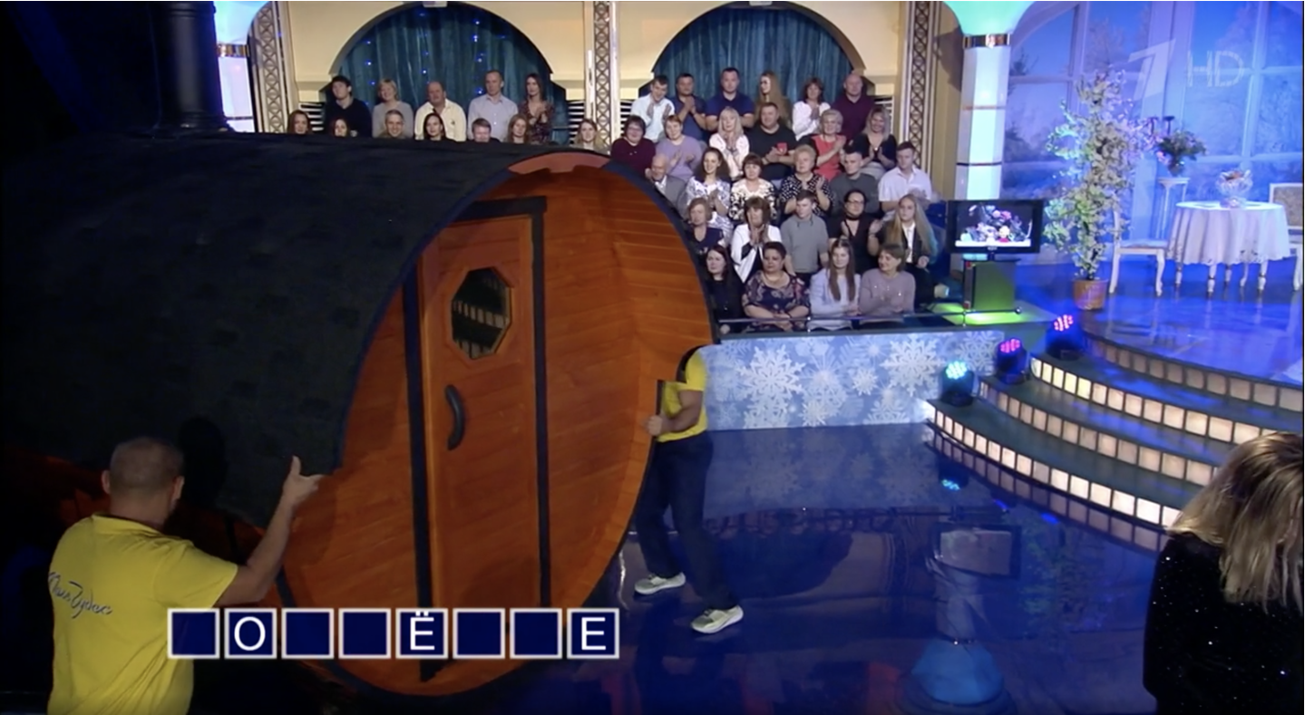 Леонид Аркадьевич Якубович по достоинству оценил подарок в виде бани-бочки на съемках передачи «капитал шоу Поле Чудес»